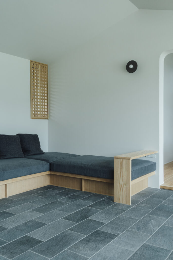 造作ソファを設置したリビングの床は、玄関から続けてタイルを貼ることで、窓と同じく繋がりをもたせた。