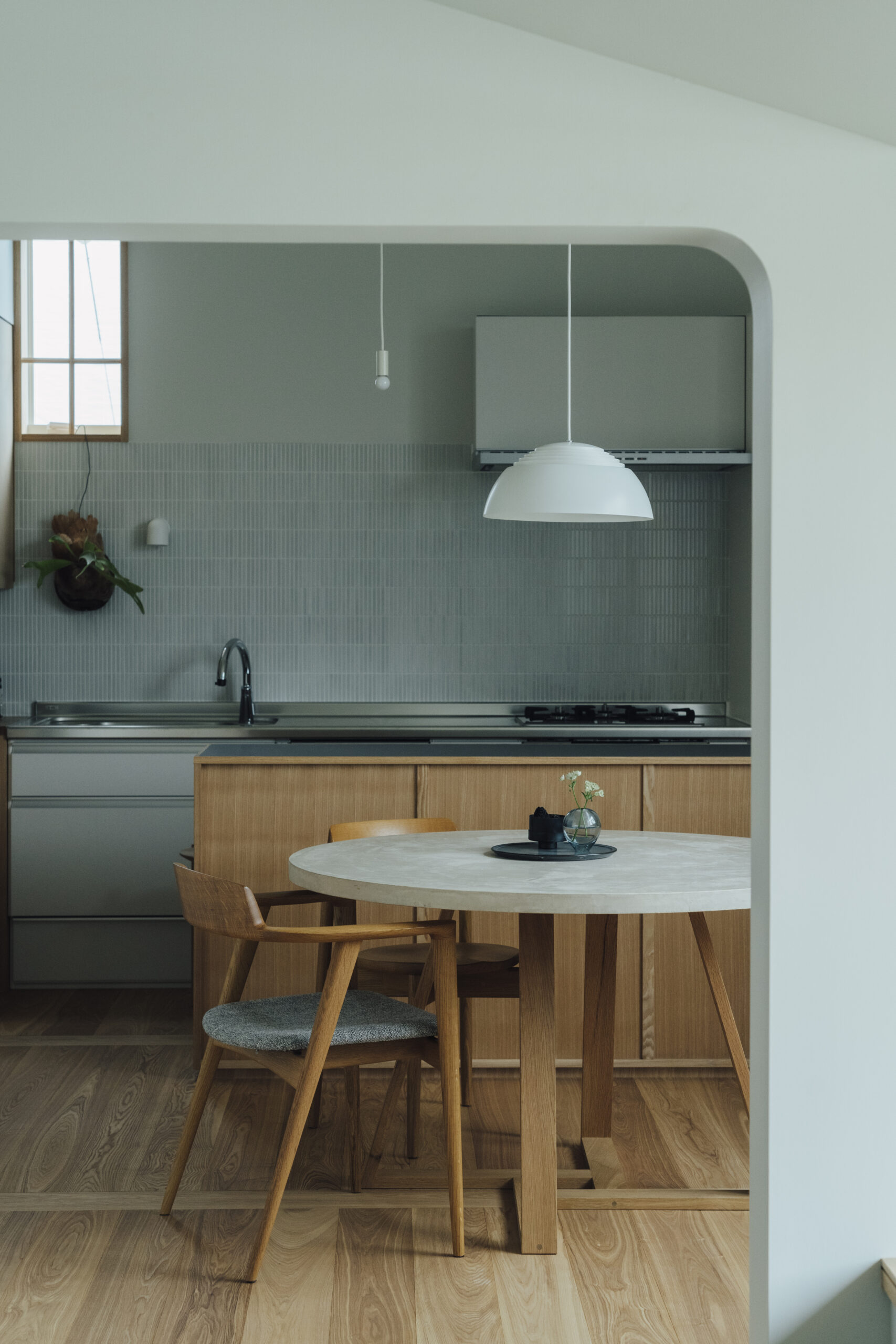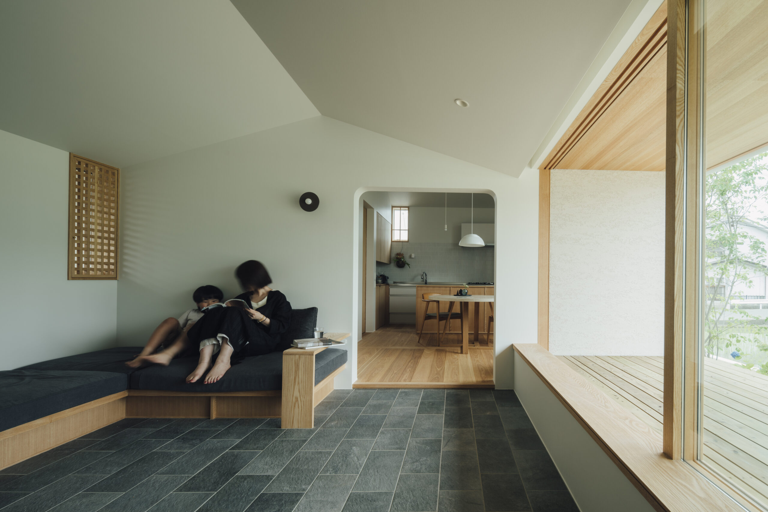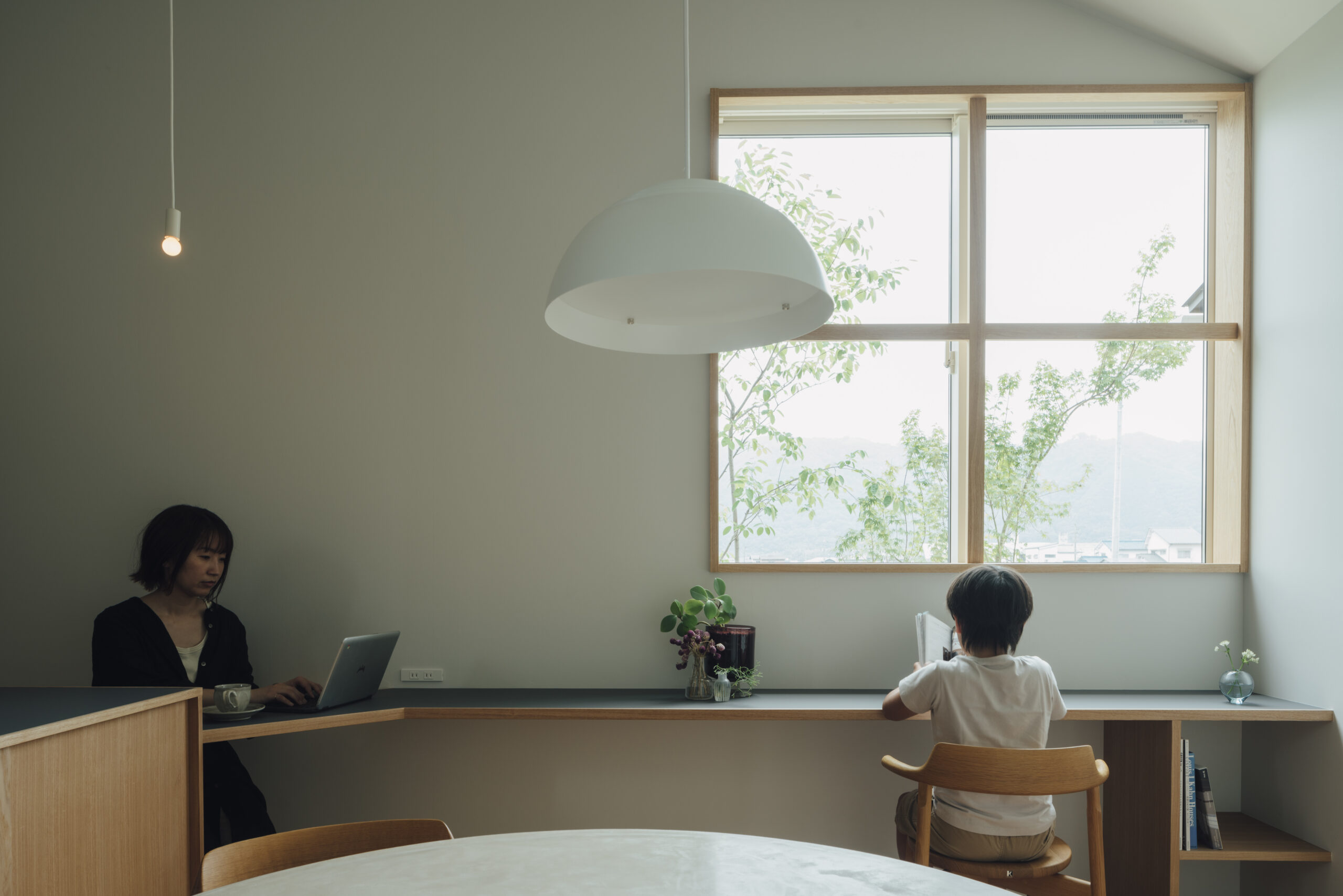 土地探しから始まった今回の家づくり。20区画のうち、南側に山が見える唯一の区画だった。調整区域のため、今後近隣に住宅が建つことがなく、南側の山の景色はこの先ずっと見られるであろうと、この土地を提案した。あの山がずっと綺麗に見えるように、どう設計するか。それが今回の家づくりの一番のテーマであった。玄関からリビングへと広がるワイドな窓は、山の尾根を横長に、山々を一望できる。その窓とは対照的に、小さく絞ったDKの窓からは、山が切り取った絵のように見える。そこから差し込む光が、天井高を上げたDKの余白の中で混ざり合い、気持ちの良い空間が生まれる。造作ソファを設置したリビングの床は、玄関から続けてタイルを貼ることで、窓と同じく繋がりをもたせた。どの部屋にいても山の見え方を楽しめるよう、それぞれの窓の性格を読み取りながらつくった空間である。平屋ではあるが、ロフトを作り、そこを子どもたちが寝られる子ども部屋に。その下に、子どもたち二人の勉強部屋をつくり、同じ空間に共同して過ごせるようにした。開放的なリビングでありながら、余白と落ち着きのある空間をつくりたかった今回の建築は、山の姿を楽しめるこの土地だからこそ実現できた。光・風・山の尾根を感じながら、おおらかに、ゆとりを持った暮らしを味わっていただきたい。