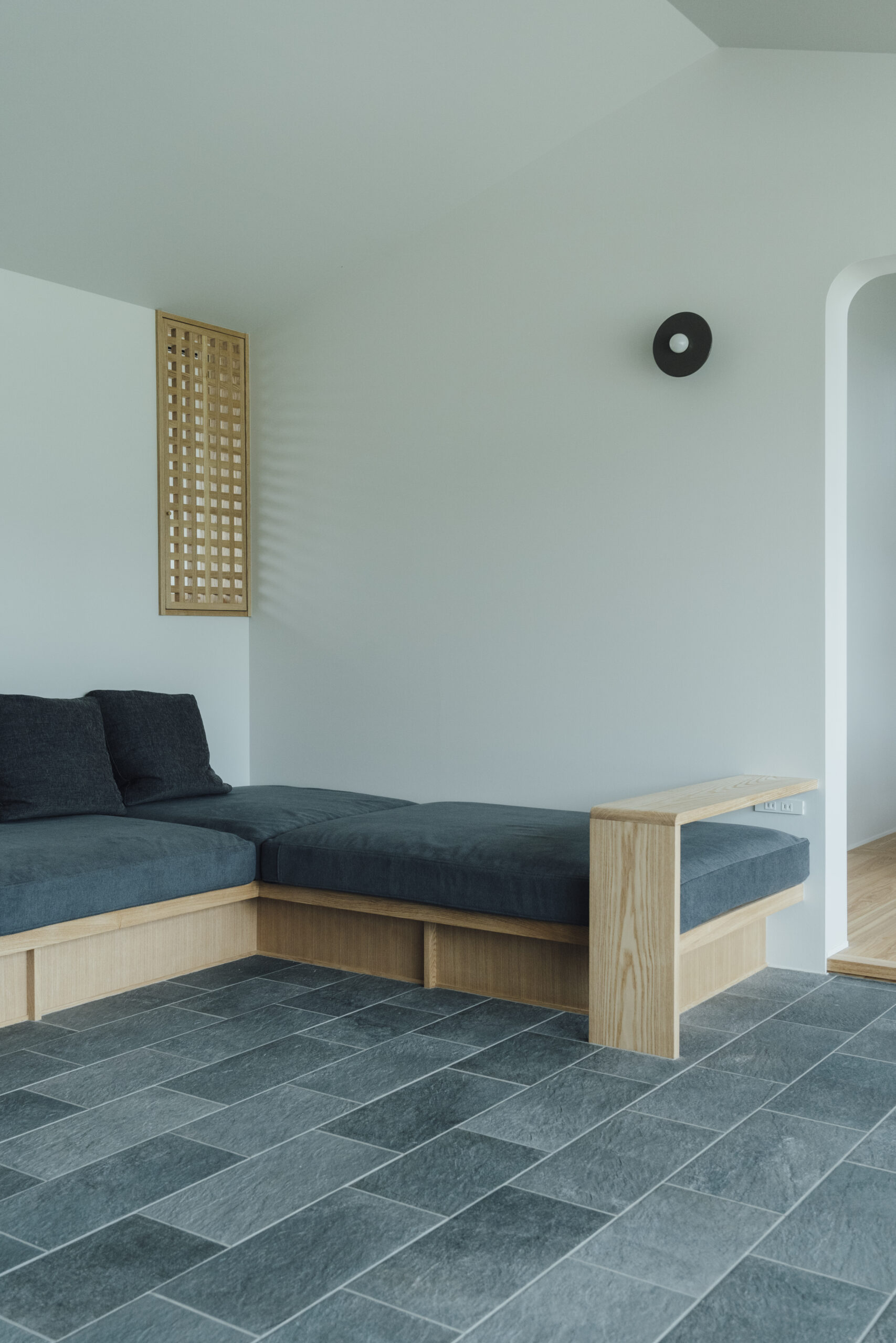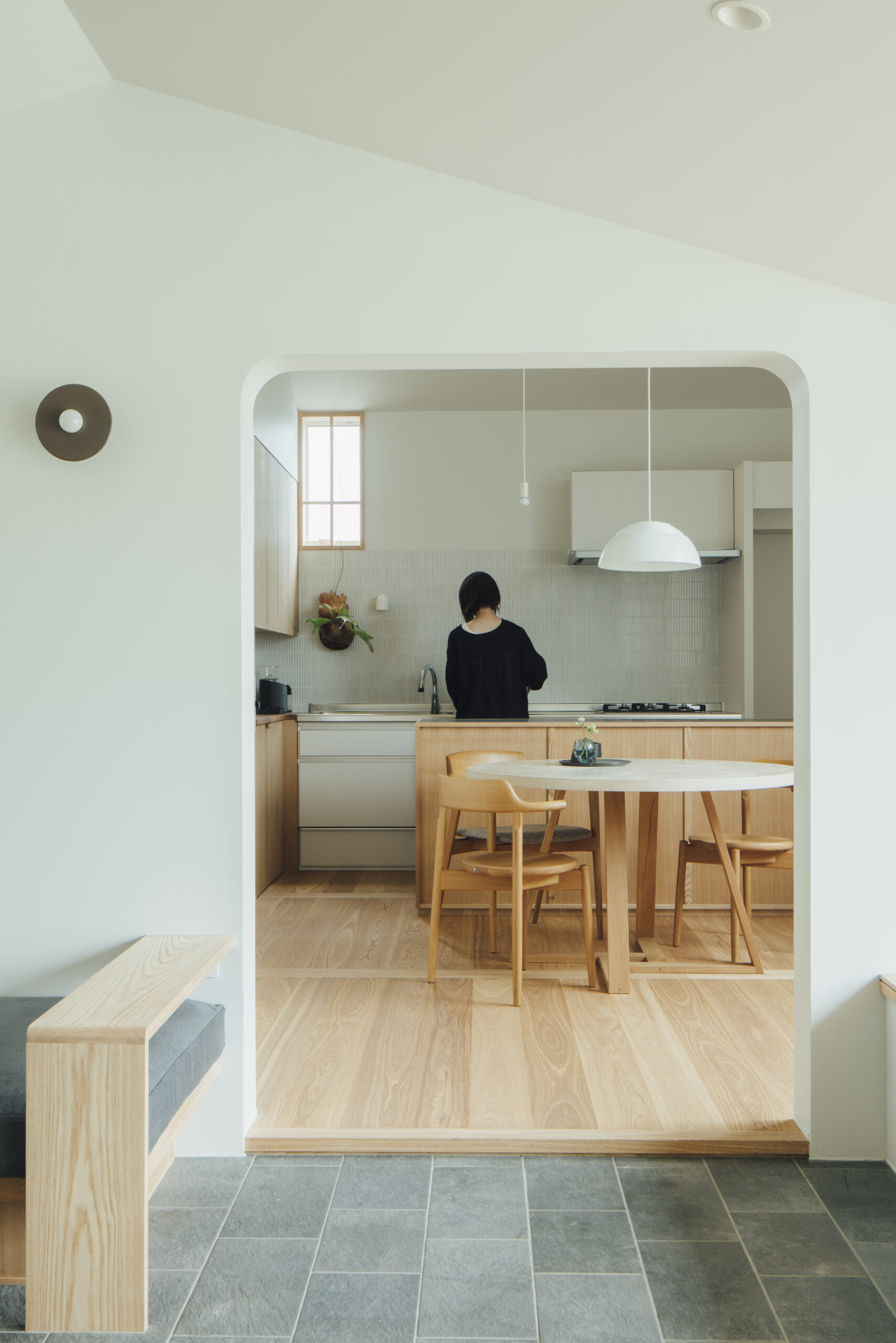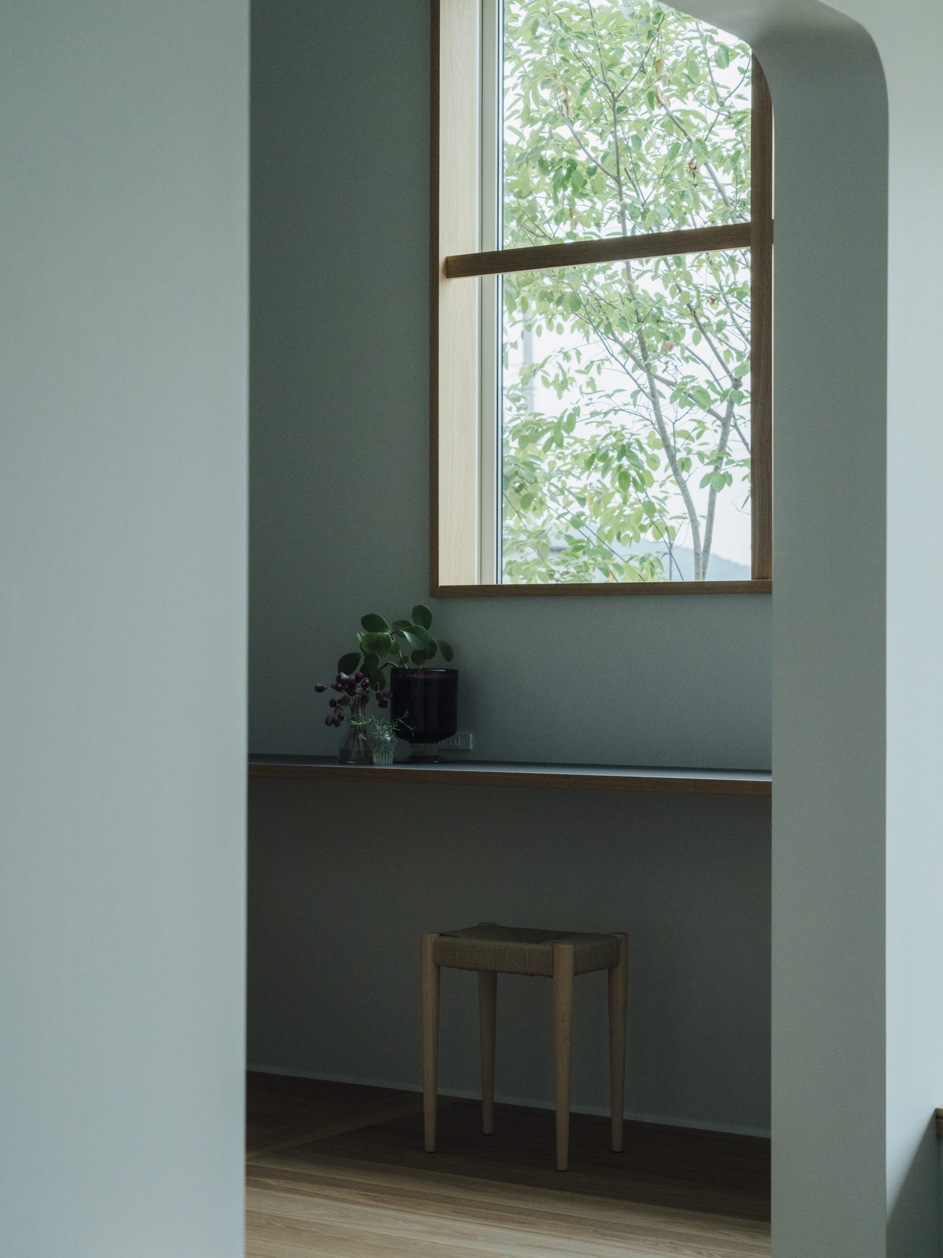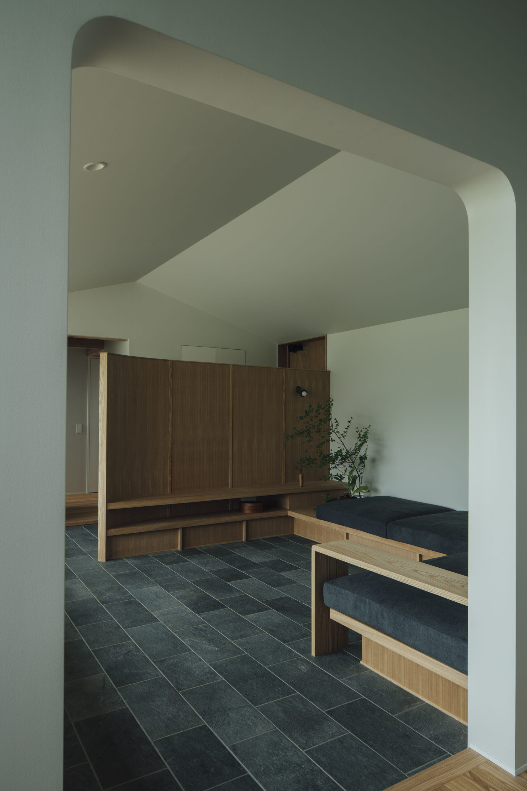 土地探しから始まった今回の家づくり。20区画のうち、南側に山が見える唯一の区画だった。調整区域のため、今後近隣に住宅が建つことがなく、南側の山の景色はこの先ずっと見られるであろうと、この土地を提案した。あの山がずっと綺麗に見えるように、どう設計するか。それが今回の家づくりの一番のテーマであった。玄関からリビングへと広がるワイドな窓は、山の尾根を横長に、山々を一望できる。その窓とは対照的に、小さく絞ったDKの窓からは、山が切り取った絵のように見える。そこから差し込む光が、天井高を上げたDKの余白の中で混ざり合い、気持ちの良い空間が生まれる。造作ソファを設置したリビングの床は、玄関から続けてタイルを貼ることで、窓と同じく繋がりをもたせた。どの部屋にいても山の見え方を楽しめるよう、それぞれの窓の性格を読み取りながらつくった空間である。平屋ではあるが、ロフトを作り、そこを子どもたちが寝られる子ども部屋に。その下に、子どもたち二人の勉強部屋をつくり、同じ空間に共同して過ごせるようにした。開放的なリビングでありながら、余白と落ち着きのある空間をつくりたかった今回の建築は、山の姿を楽しめるこの土地だからこそ実現できた。光・風・山の尾根を感じながら、おおらかに、ゆとりを持った暮らしを味わっていただきたい。